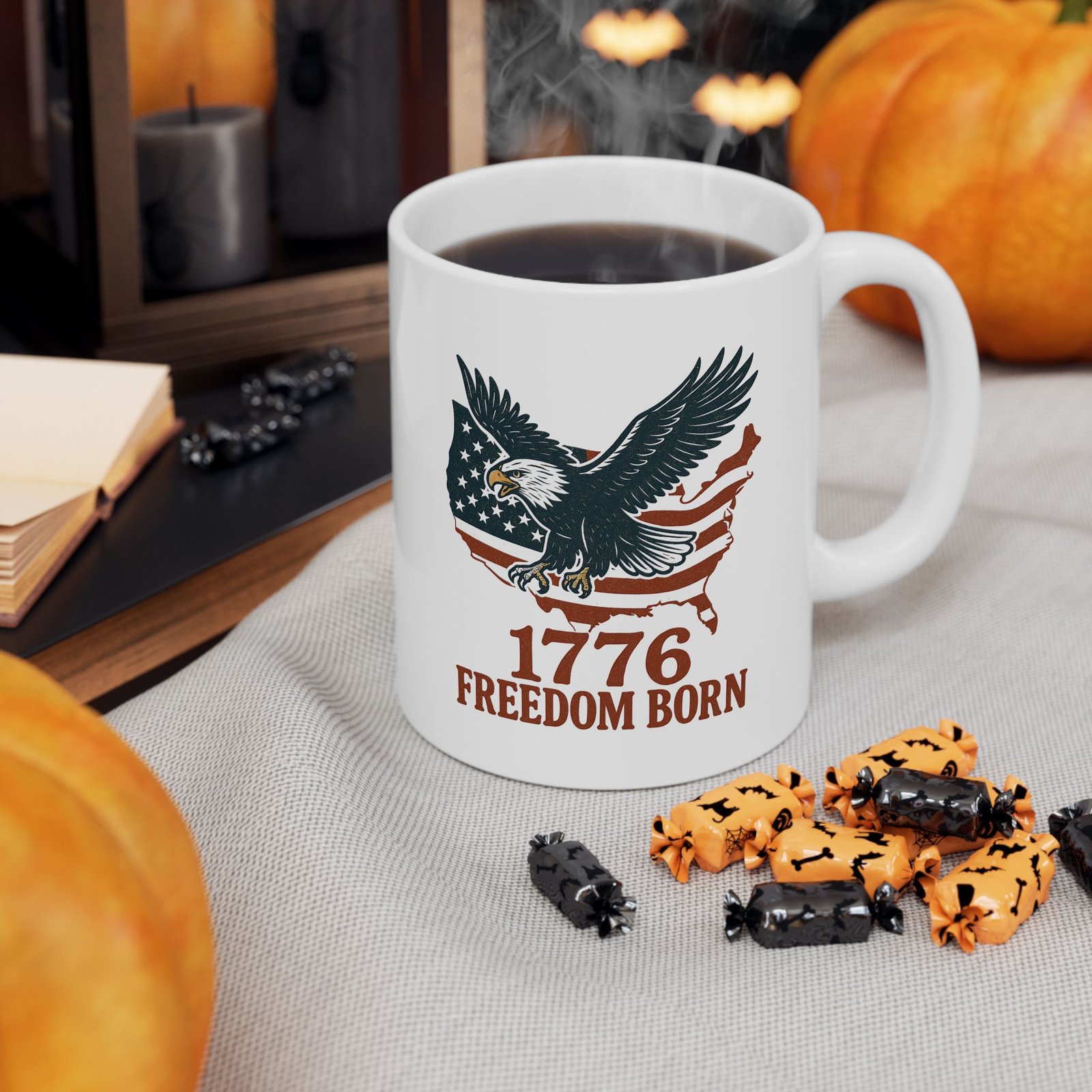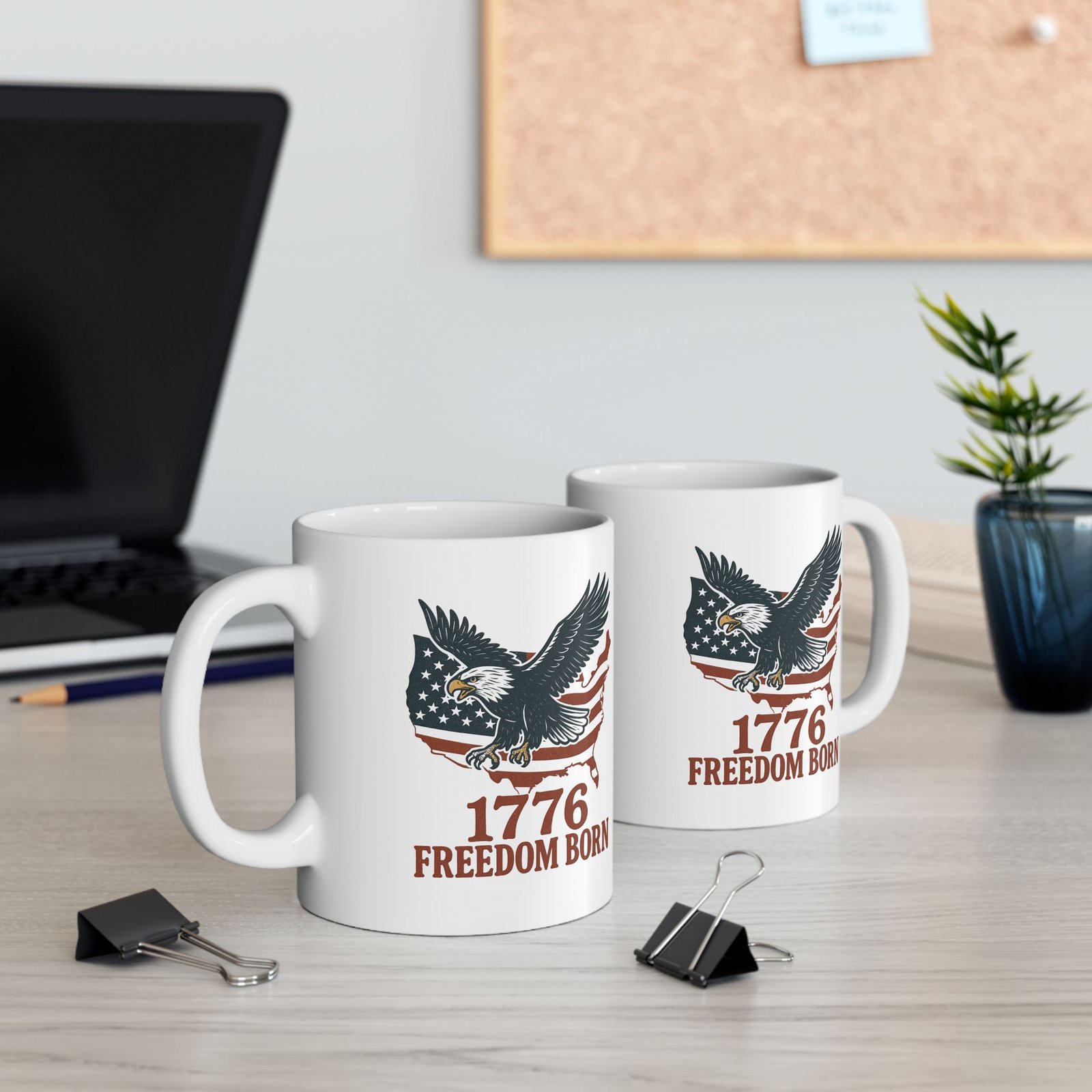 A sturdy ceramic mug that wears its pride with quiet confidence. The glossy white surface makes the artwork pop—muted Americana tones, an eagle silhouette and flag details wrap the sides so the design reads whether you’re holding it or setting it down. It feels balanced in the hand thanks to a comfortable C-handle and a smooth rim that invites slow sips. Durable enough for daily routines: microwave-safe for quick reheats and dishwasher-safe for easy cleanup. Lead- and BPA-free, available in two sizes to match your morning ritual, and finished with bright, long-lasting printing that keeps the imagery crisp through regular use.