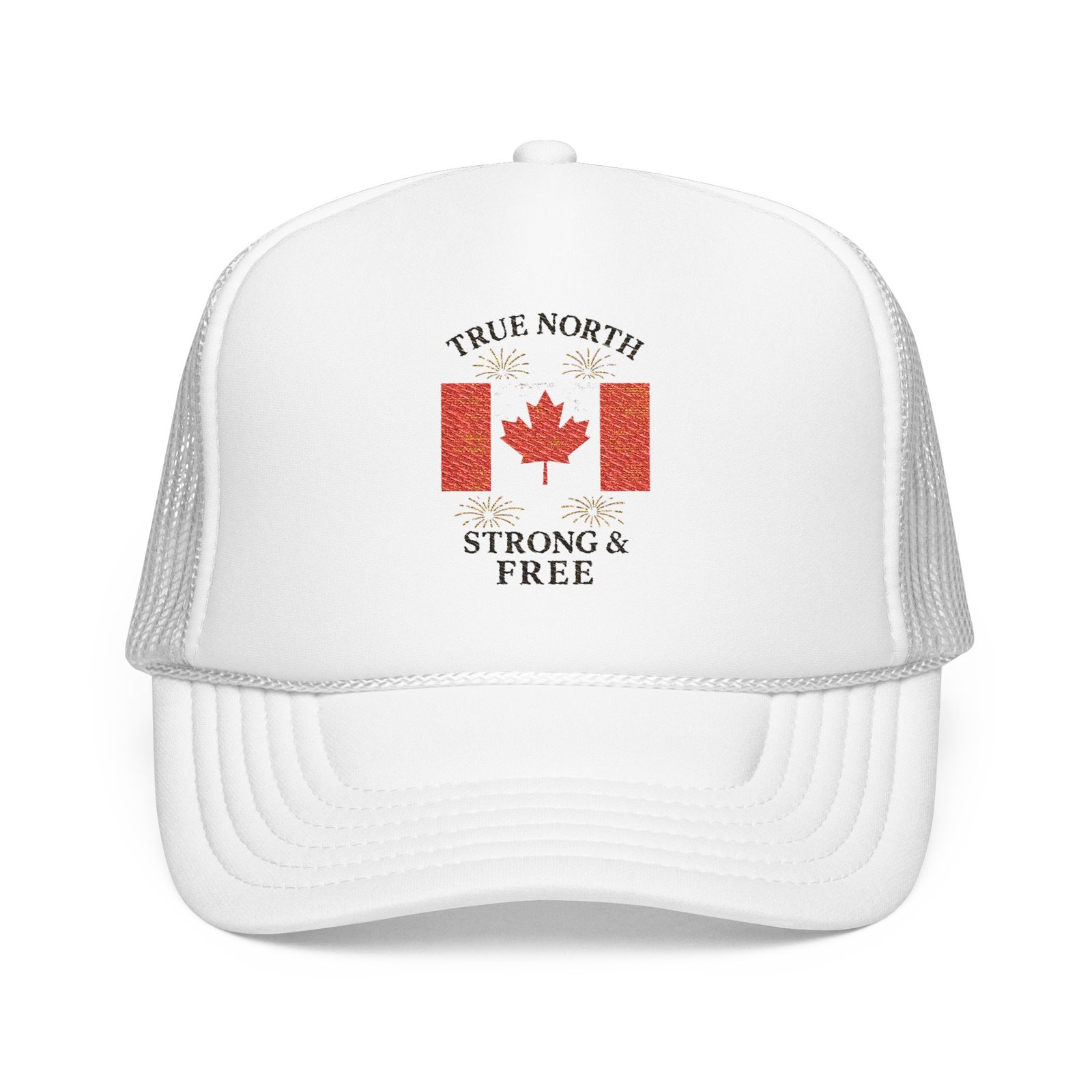 Lightweight, bold, and unmistakably Canadian — this foam-front trucker hat brings a classic roadside-vendor feel to everyday wear. The high-profile, structured front gives your embroidered maple and motto a clean, upright display while the ventilated mesh back keeps you cool on sunny drives, backyard barbecues, and weekend hikes. The foam front and laminated fabric hold shape over time, so the hat keeps its crisp look through travel, commuting, and whatever the day brings. Adjustable snap closure and a comfortable braided sweatband mean it sits right where you want it, whether you’re steering a boat on the lake or cheering at a local parade.