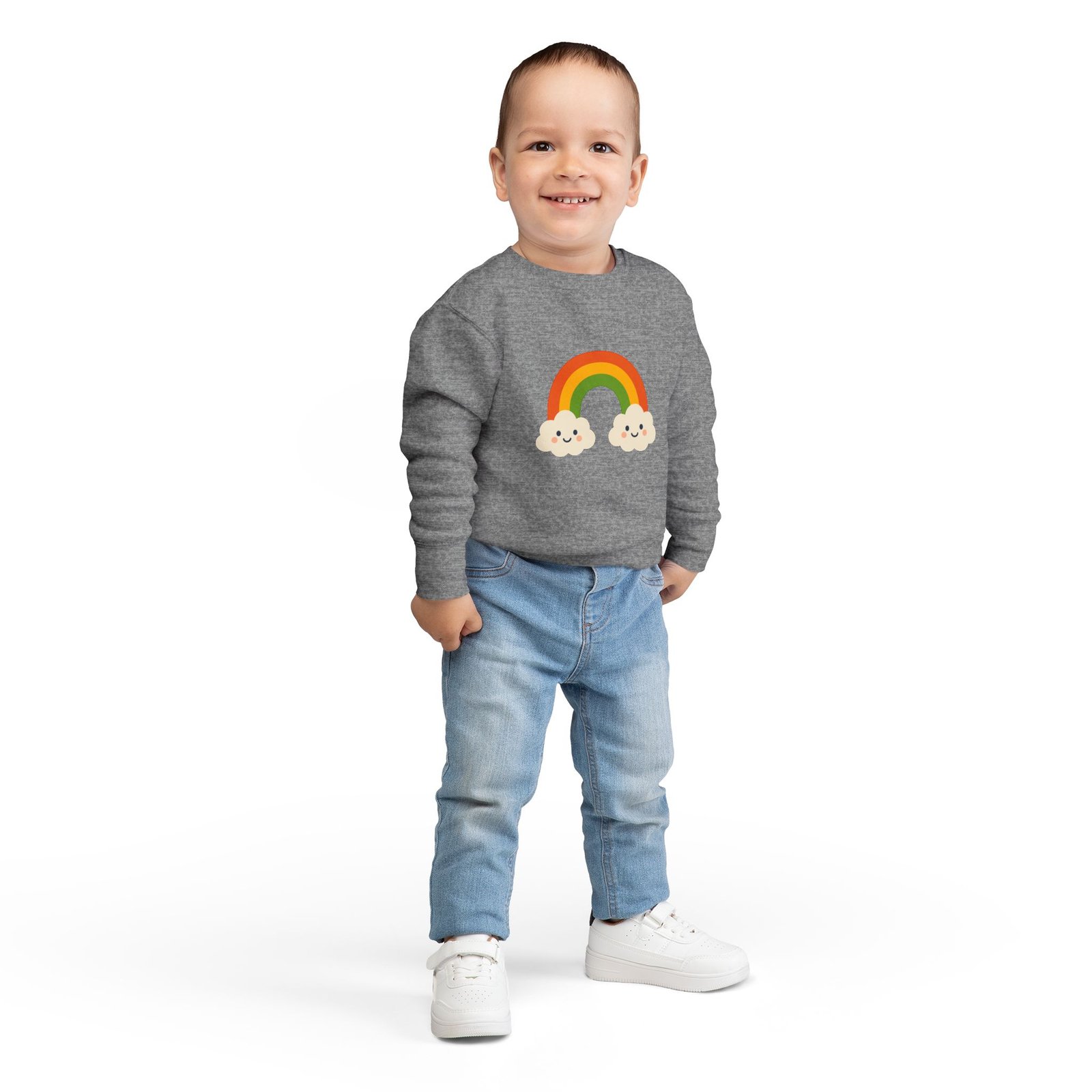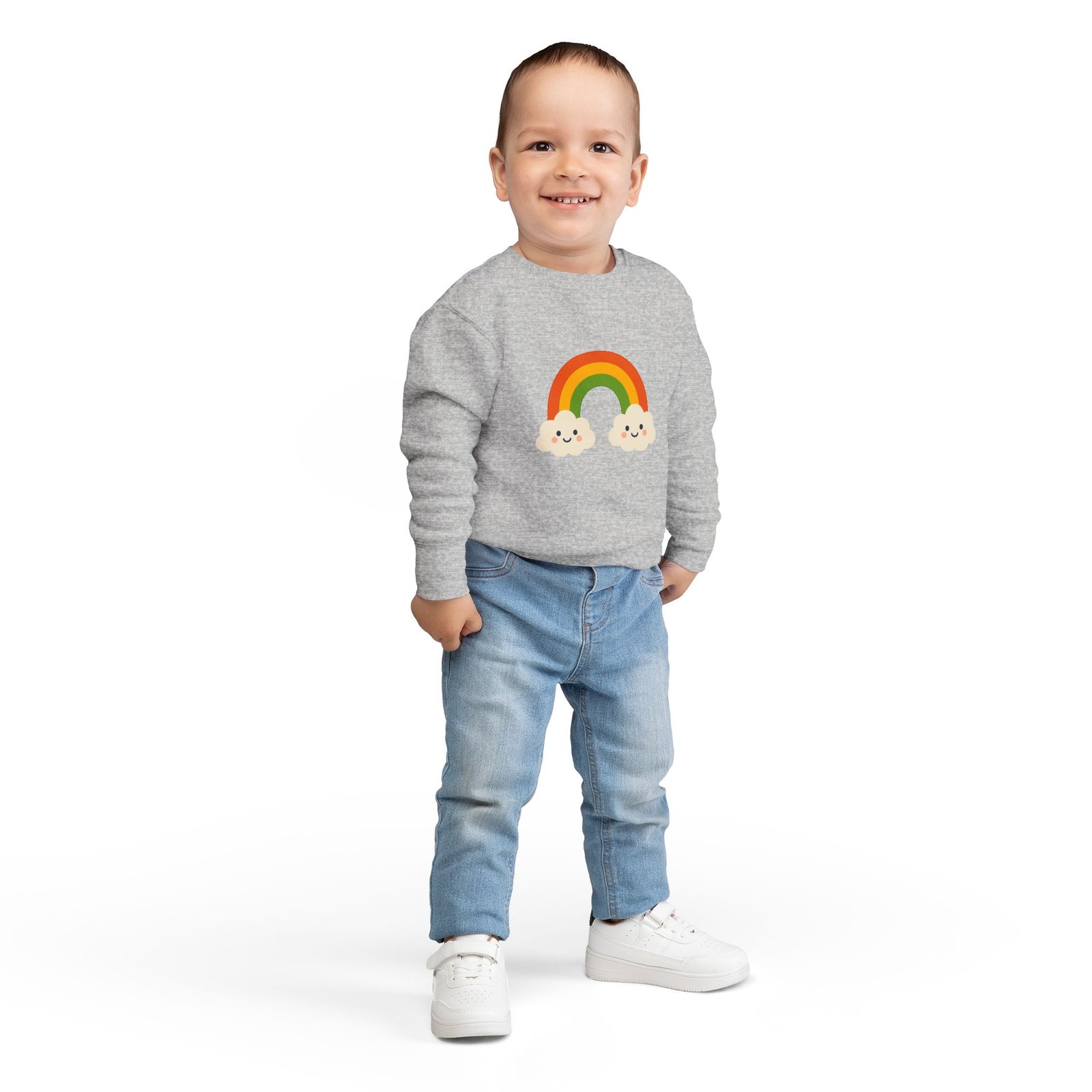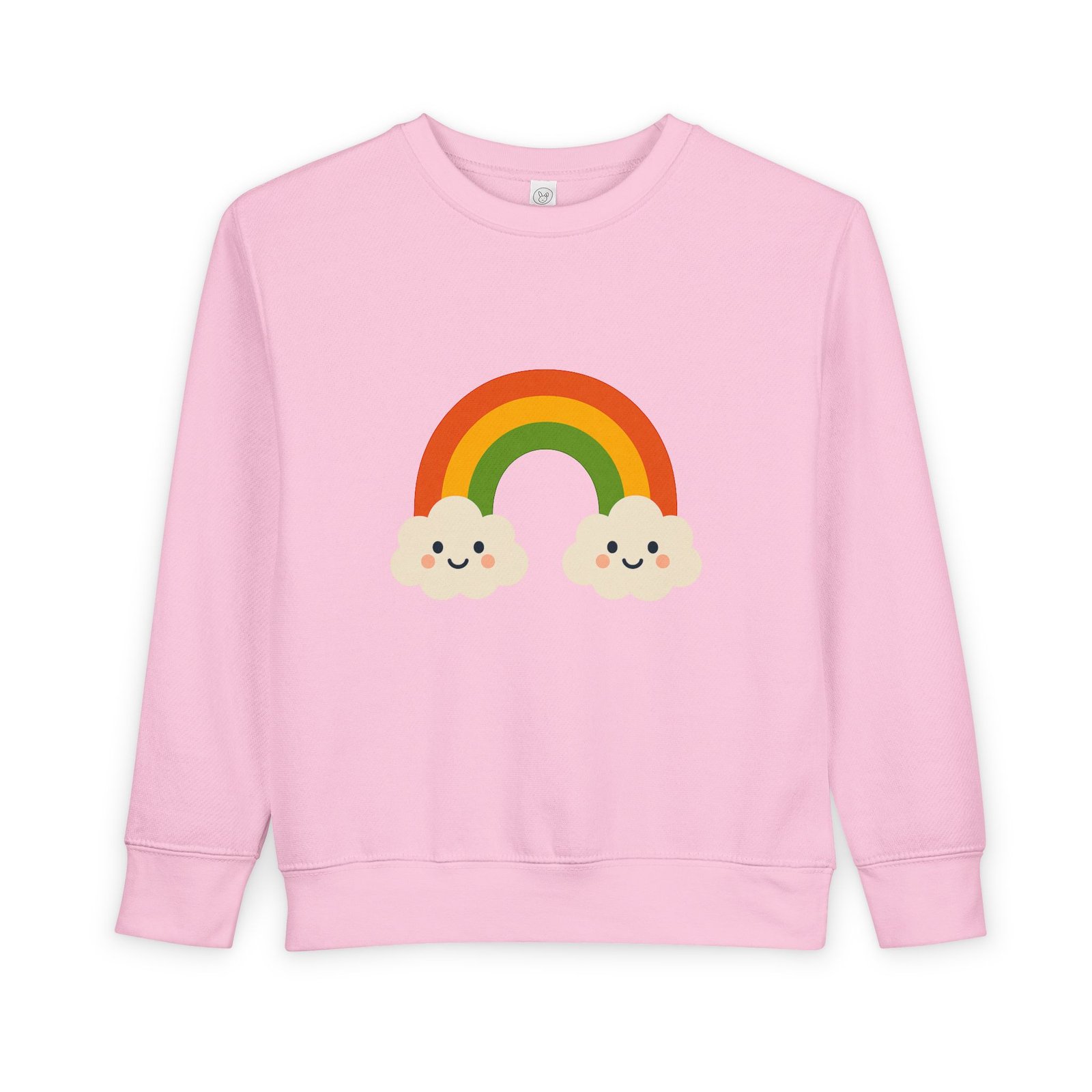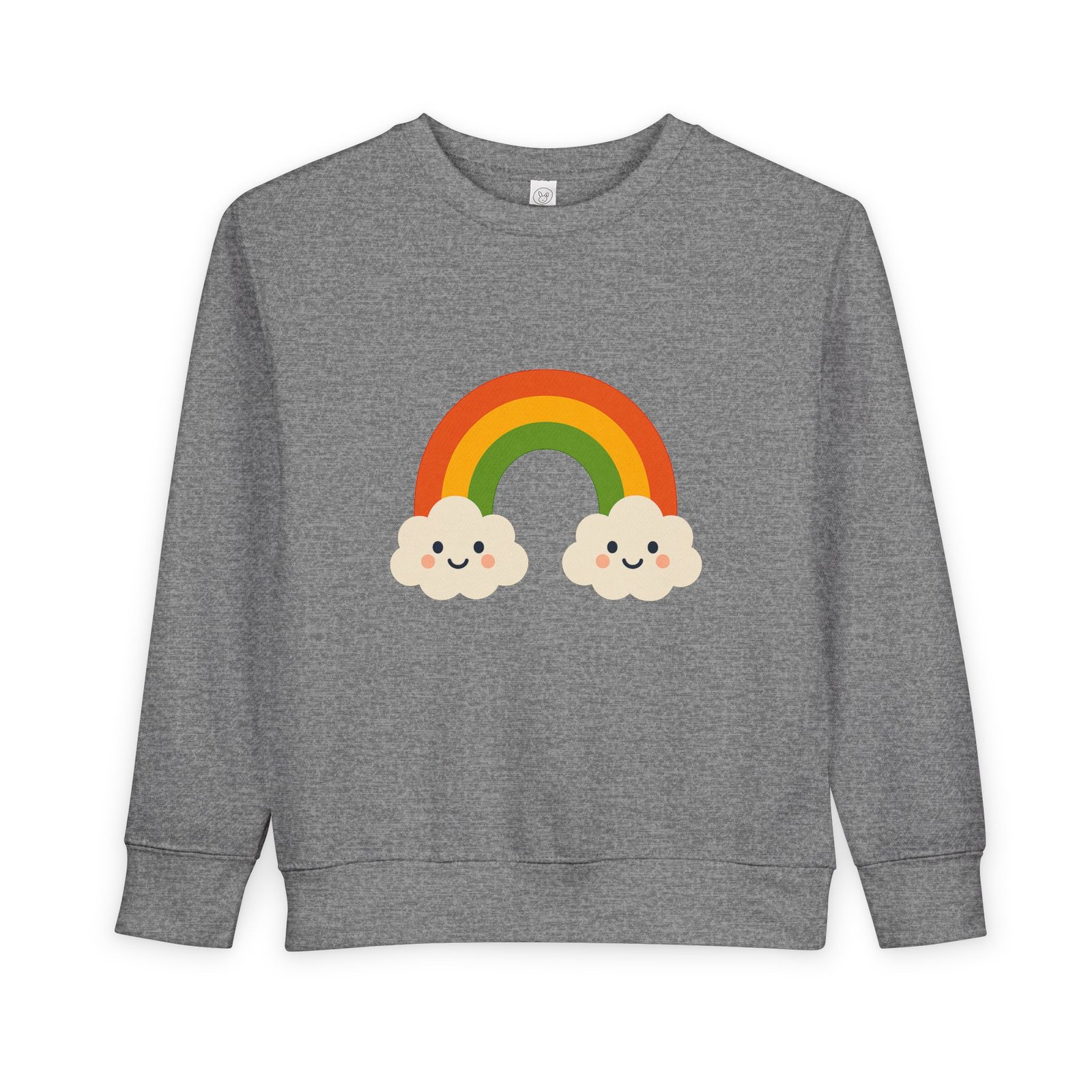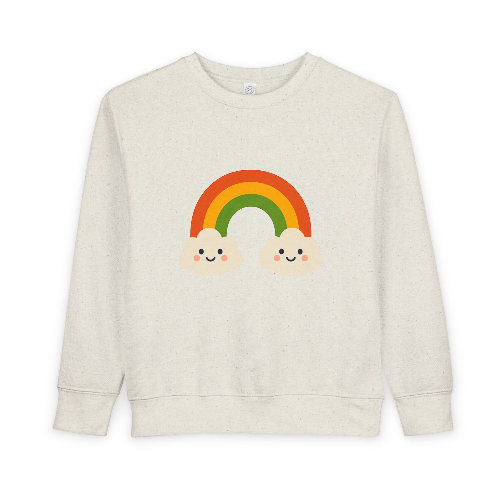 Soft, cozy toddler sweatshirt that brings a little sunshine to everyday play. The cheerful rainbow and two smiling clouds sit gently on a speckled natural-heather fabric, giving a handmade, storybook feel. Lightweight but warm, the mid-weight cotton-blend holds shape through washes and playtime. Thoughtful details—like a tear-away EasyTear label and ribbed cuffs—keep tiny wearers comfortable while parents appreciate durable coverstitching and reliable construction. It’s a calm, colorful layer that fits into slow mornings, park visits, and nap-time cuddles.